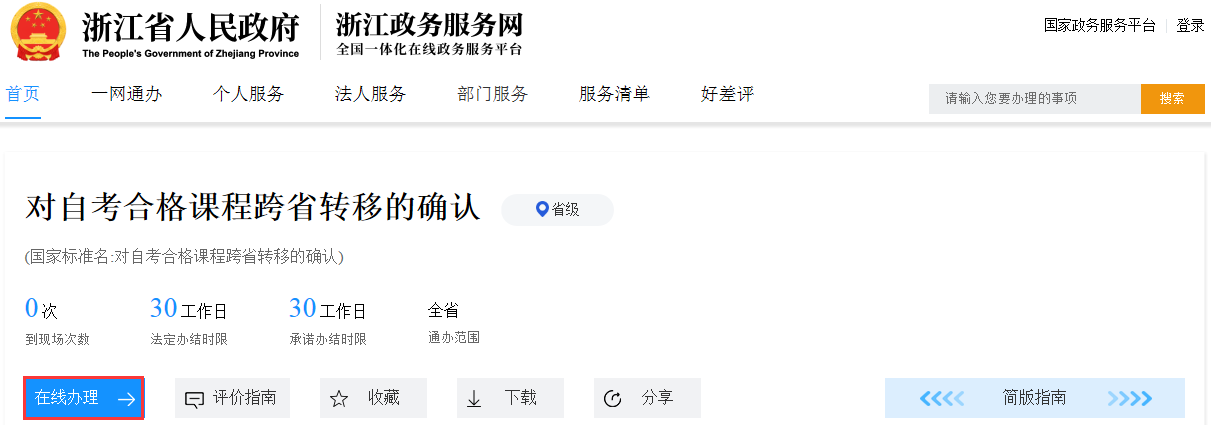 登录浙江政务服务网(www.zjzwfw.gov.cn)[可通过浙江省教育考试院官网(www.zjzs.net)“最多跑一次-自考合格课程跨省转移确认申请”或浙江省教育考试院自学考试信息网(zk.zjzs.net)“我的申请-转考申请”链接]